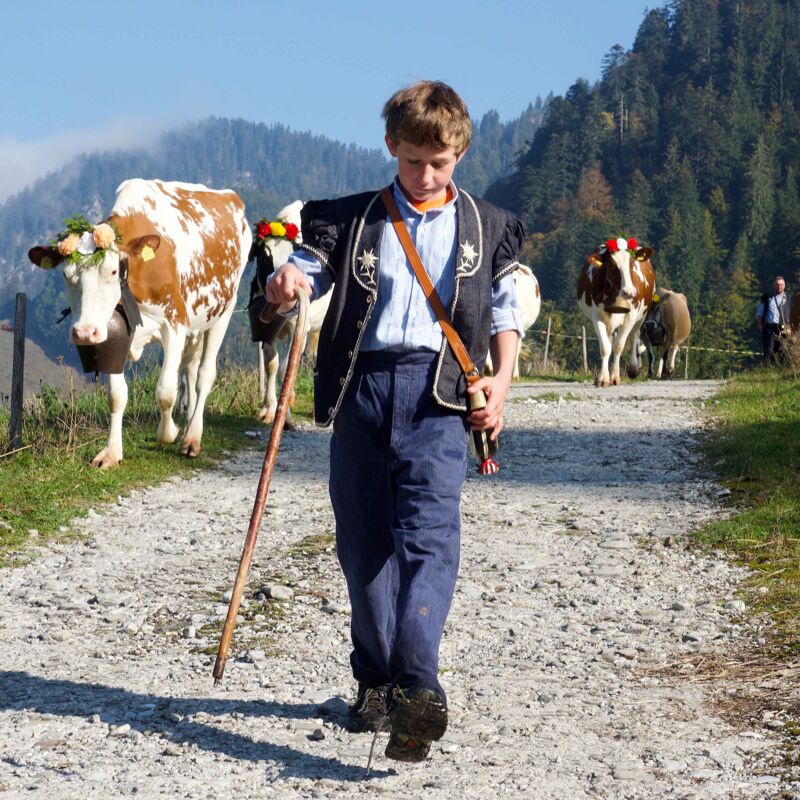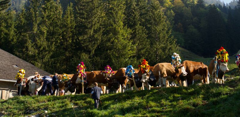 Iedereen is er klaar voor. Ook de jonge meisjes en jongens, allemaal kinderen van boeren met koeien die meelopen. De jongens zijn verkleed in de bredzon, de meisjes in dazquillon, fleurige klederdracht en de ouderen lopen in overall. Peter vertelt; “de koeien zijn onrustig, ze willen lopen”, merkt Peter op. En dan is daar het sein. Jacques Ruffieux loopt, samen met de meisjes en de jonge vrouwen, voorop. Verdeeld over de kudde lopen de jongens en de mannen. Het is groot feest, met schitterend weer”. De groep wordt op weg naar de stal door Charmey, toegejuicht en -geklapt.