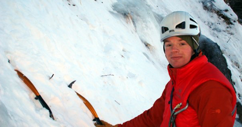 Bas, 20 jaar oud, tijdens het watervalijsklimmen