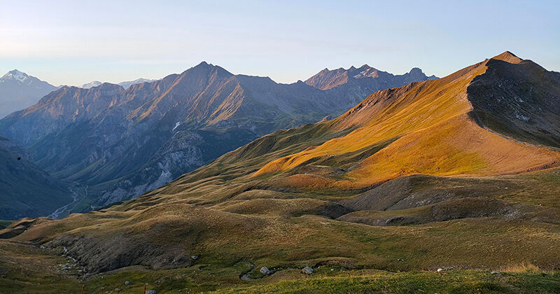 Vanuit de Refuge de la Croix du Bonhomme hebben we in de vroege ochtend prachtig uitzicht op het landschap. De opkomende zon legt de bergflank in een warme gloed. Mijn dag kan nu al niet meer stuk.