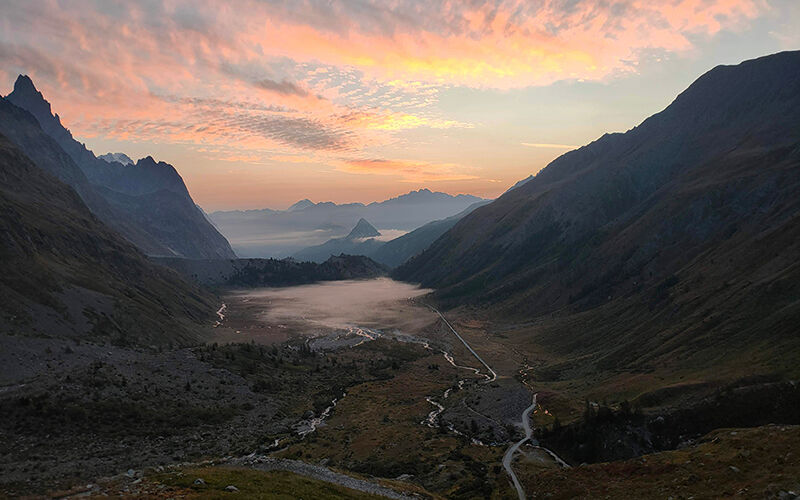 Wanneer ik 's ochtends uit mijn raam kijk na een nacht in Rifugio Elisabetta, zie ik bij het eerste licht de mist in het dal en vind ik het ineens helemaal niet erg dat we vroeg zijn opgestaan om bijtijds in La Visaille aan te komen.