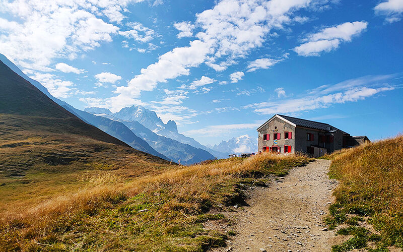 De route naar Col de Balme gaat slingerend omhoog. Ineens ligt daar boven, op de col, de Refuge du Col de Balme (2190 meter). Het is fris hierboven, maar de zon schijnt en de gezellige rode luiken nodigen me uit om nog sneller naar boven te komen. Nog een klein stukje en dan zijn we bij de hut, waar we een welverdiend glas appelsap bestellen.