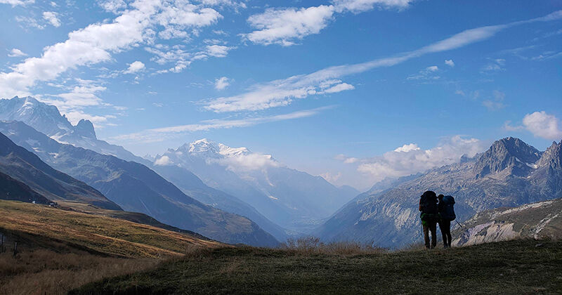 Na de Col de Balme gaat het slingerend naar beneden, het laatste stuk van onze Tour du Mont Blanc, naar de hut La Boerne in Argentière. Nog even blijven we op de col staan. Met zicht op de Mont Blanc mijmeren we over de afgelopen week. De route, de hutten, de mensen die we ontmoetten, het weer dat zo ontzettend meezat en het fantastische uitzicht.
