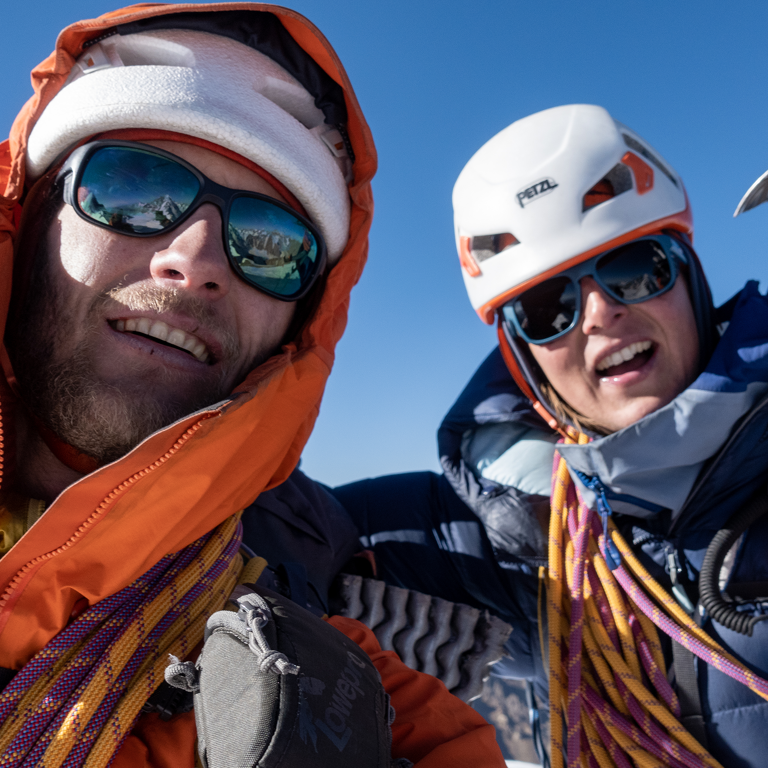 Ik geef Martin flink wat touw op de topgraat. Hij moet tussen twee torens door klimmen en hij heeft last van de touwwrijving. Ik kijk omhoog en ik zie opeens Sjoerd staan, op de top! Het is gelukt om op de markante, compacte punt top te komen. Wauw. Het was nog tot het einde spannend maar het is gewoon gelukt! Ik krijg een brok in mijn keel. Drie jaar trainen, plannen, voorbereiden en we staan gewoon als eerste op een berg via een nieuwe route. Ons gejuich galmt door het uitgestrekte berglandschap. Maar snel gaat mijn aandacht weer naar touw uitgeven en klimmen. Martin en ik zijn er nog niet…
