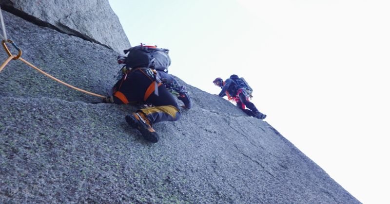 Een ogenblik later verjaagt het daglicht de donkere nacht. We arriveren bij de eerste sleutelpassage. We kunnen kiezen uit een fysieke schoorsteen of een korte off-width lengte. Voor ons zien we Maël soepel door de offwidth bewegen. Bas volgt even later. Daarna verdwijnen ze samen in het ochtendlicht. We overleggen kort en kiezen voor de offwidth lengte.
