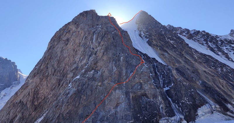 Wij blijven een dag langer in het basiskamp dan de rest van het team, om de vers gevallen sneeuw in ‘onze’ rotswand zoveel mogelijk te laten smelten. Maar na een extra dag rust en zon gaan ook Jeffrey en ik op pad. Ons doel: een onbeklommen top van ongeveer 5000 meter, die vanuit het basiskamp goed zichtbaar is. We noemen de berg ‘Frendo’, omdat we de berg lijkt op de beroemde Frendo-pijler in Chamonix. Voor onze beoogde route moeten we net als in de Franse Frendo-pijler eerst een lange rotswand beklimmen, die daarna uitkomt op een sneeuwgraat die rechtstreeks naar de top voert.