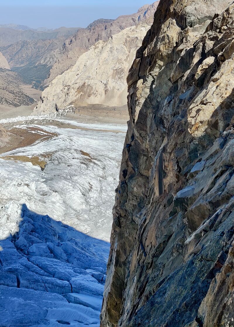 Na nog één keer van het uitzicht genoten te hebben, begint de terugweg. Bij de eerste abseil blijft het touw vastzitten, maar na wat gesjor, getrek en heen en weer klimmen kunnen we weer verder. Als we bij de tent op het sneeuwcolletje aankomen, is het al laat in de avond. Omdat onze afdaalroute steenslaggevoellig is, besluiten we nog een nachtje te slapen en dan in de ochtendkou verder ab te seilen.