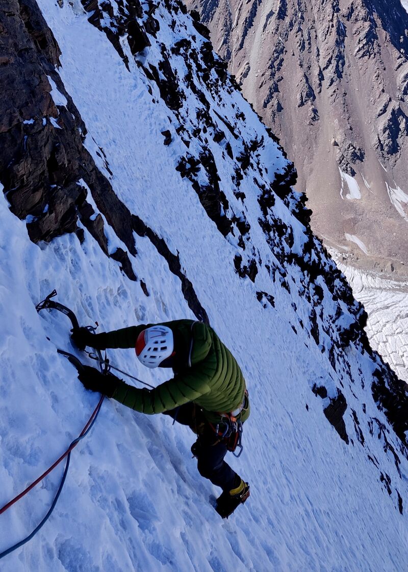 Met 600 meter rots achter de rug, ligt nu de laatste 400 meter ijs voor ons. Die begint met een vlakke graat, maar hoe dichter we bij de top komen, hoe steiler deze wordt. Net voor de top wordt het ijs nog even wat slechter, om het spannend te houden. Gaandeweg verandert het ijs in ongebonden grote sneeuw- en ijskorrels, waardoor we net voor de top nog een keer twijfelen om door te gaan, omdat er in deze sneeuw geen zekeringen te plaatsen zijn en het ook moeilijk afdalen is. Gelukkig is er meer naar rechts tussen de rotsen goed ijs te vinden om af en toe in te zekeren.
