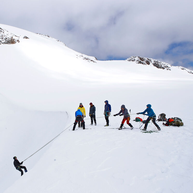 'De snelste en effectiefste methode is de Mannschaftszug', legt de Nederlandse berggids Boris Textor uit. 'Je trekt met zijn allen de persoon uit de spleet.' Mocht dat niet lukken, omdat je bijvoorbeeld maar met zijn tweeën bent, kun je een Seilrolle (touwtakel) bouwen. Tegelijkertijd kan het 'slachtoffer' zichzelf met de prusik-techniek ook langs het touw omhoog takelen. 'Deze vaardigheden moet je echt regelmatig oefenen om het in een noodsituatie te kunnen doen', benadrukt Boris. Een boodschap die gelukkig ook profi-sporters en organisaties regelmatig uitdragen. Check bijvoorbeeld How to crevasse rescue van splitboarder Xavier De Le Rue, Sauvetage crevasse van de Franse gidsenopleiding ENSA, de Safety Academy van Ortovox of deze ski touring-brochure van Petzl.