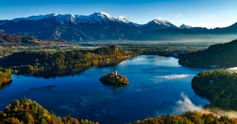 Aan het meer van Bled staat een groot rood hart waarmee velen zich laten fotograferen. Op de achtergrond van die foto’s zie je het spiegelgladde meer van Bled, de Maria Hemelvaartskerk op het eilandje in het meer of het kasteel van Bled, een fort hoog boven het water.
