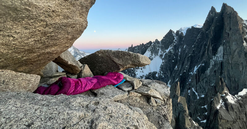 Foto 7: oefenen met bivakkeren tijdens de zomer trainingsstage in de route op de Aiguilles Chamonix Traverse, een tweedaagse overschrijding met een bivak op de Aiguille Fou.