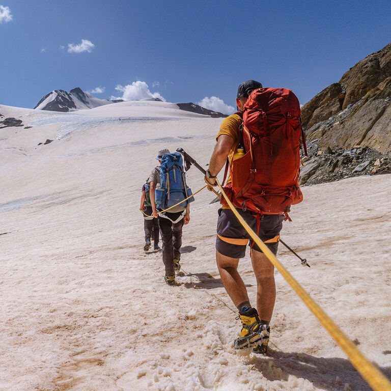 Op de vierde dag staat de meest uitdagende etappe van de Ortler Höhenweg op het programma. Vandaag steken we namelijk een gletsjer over; het is de enige van de trail en we bestuderen de kaart nog maar een keer. We hebben een berggids gehuurd voor de gletsjeroversteek, die we ontmoeten op de Eissee Pass. Het juiste materiaal is belangrijk voor een veilige oversteek, en nog belangrijker is dat je weet hoe je het gebruikt. De berggids heeft het allemaal bij zich: touw, pickel, klimgordel, karabiners en stijgijzers. Als we op de kaart kijken, lijkt het erop dat we de Eissee Pass helemaal niet kunnen bereiken, omdat de gletsjer zich daarvoor al bevindt. We bellen met de gids, die ons geruststelt en zegt dat de gletsjer op dat stuk al gesmolten is. We kijken nog eens op de kaart en die blijkt tien jaar oud te zijn. Zo snel kan het dus gaan.
