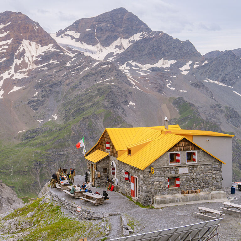 Het is alweer dag vijf als we flink wat kilometers door het Zebru-dal maken richting het dorpje Sant’Antonio. Het pad slingert op en neer langs steile bergflanken over een prachtig stenen pad. De paden zijn hier smal en de afgronden steil. Gelukkig is het pad niet technisch, maar je wilt hier absoluut geen misstap maken. We lopen richting de prachtige berghut Quinto, die op een stenen heuvel ligt met het mooiste uitzicht over de omringende bergen. Na een espresso – altijd goed in Italië – dalen we af. Eerst richting Rifugio Campo, waar je ook kunt overnachten, en dan naar het dorpje. We zijn er bijna, maar niet voordat we een enorme plens water over ons heen krijgen en een harde klap horen. Regen en onweer dus! Nadat ik mijn backpack binnenstebuiten heb gekeerd (na al die zon lag mijn regenjas helemaal onderop – nooit handig), rennen we door het struikgewas naar een houten hutje, waar we schuilen. Vijf minuten later is de kust weer veilig en dalen we verder af naar het dal, waar we overnachten in Albergo Zebru. Het is fijn om weer even in de bewoonde wereld te zijn en wat inkopen te doen bij de lokale supermarkt en een frisse douche te nemen!