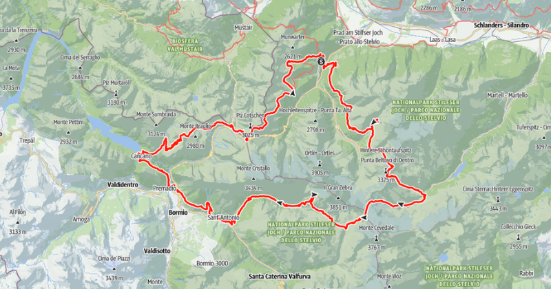 De volgende morgen zetten we de eerste stappen op de route. Vanaf de pas gaat het pad kort maar steil omhoog naar Rifugio Garibaldi. De hut, die meer wegheeft van een middeleeuws kasteel dan een berghut, ligt net boven de Stelviopas. De hut is al een tijdje gesloten en vanaf hier lopen we zo het pad op. Het is een prachtige dag, de zon schijnt en we lopen langs een prachtige bergflank met uitzicht op de Ortler. Het is een fijn begin, we dalen vandaag vooral, naar het dorpje Stilfs, waar je dus ook met deze tocht kunt starten.