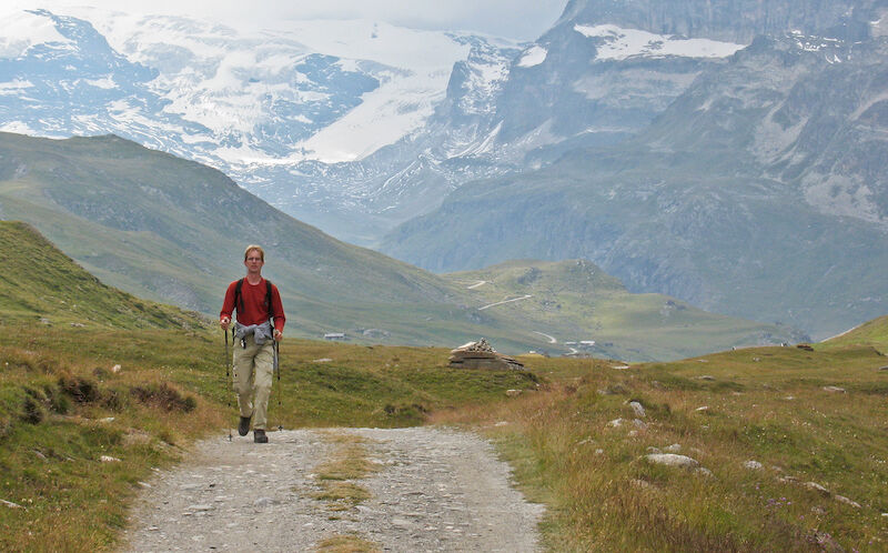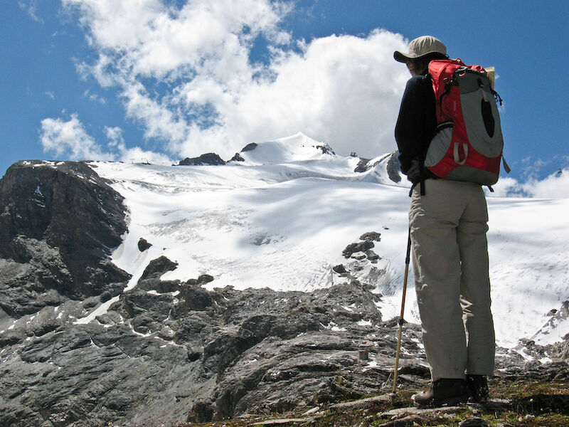 Het was zes maanden na mijn knieoperatie en de bergen intrekken was al geen logisch besluit. Een zware trektocht maken zou in de categorie ‘dom’ vallen. We waren daarom koortsachtig op zoek naar een afwisselende dagtocht met maximaal 500 meter stijgen die in zo’n zes uur te lopen was. Mokkend over de beperking die me was opgelegd, zag ik de vinger van Monique angstig diep het hooggebergte in glijden. Mijn humeur klaarde op en mijn hart begon sneller te kloppen. Er ontstond een huttentocht voor beginners met maximaal 550 hoogtemeters per dag. En nog mooier: deze trektocht voor beginners beloofde uitzichten voor gevorderden!