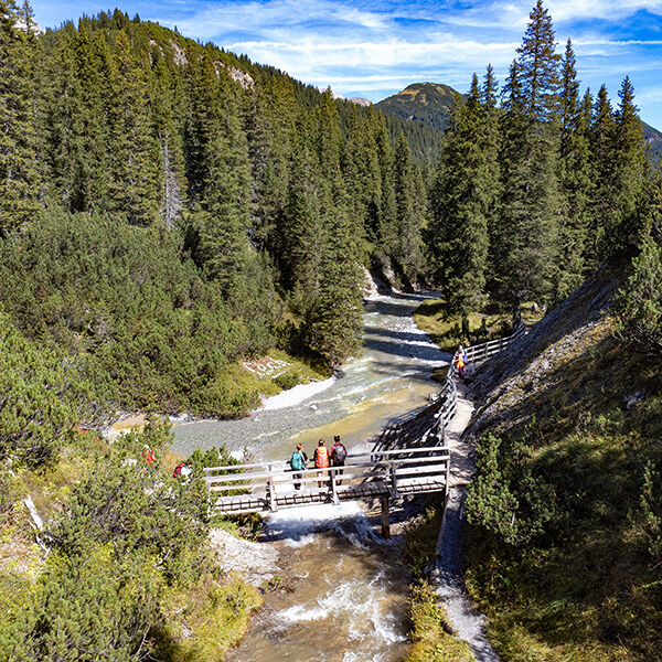 We blijven vandaag nabij de rivier en aanschouwen hoe deze steeds smaller en bruisender wordt, naarmate we verder de bergen in wandelen. Onze weg volgt bergpaden langs de bosrand, waardoor we diep het Lechdal in kunnen kijken. Als we tenminste niet weer overvallen worden door een plotselinge plensbui... In Gehren schuilen we doorweekt bij de Gehrnerhof, waar Lisbeth een verrukkelijk warm appeltaartje tevoorschijn tovert. Zonder menukaart kookt de energieke dame van in de zeventig waar ze zin in heeft. Met tegenzin verlaten we Lisbeth's knusse plekje om de laatste twee kilometer naar Warth te volbrengen. Het adembenemende uitzicht op de Alpen in Vorarlberg vormt een prachtige afsluiting van deze etappe.