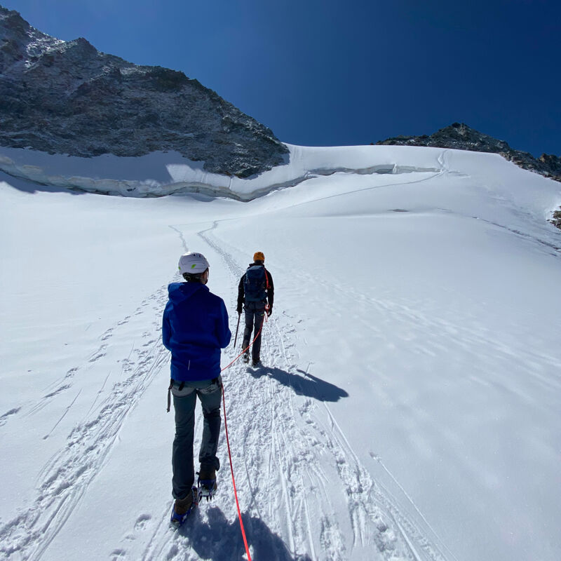 Ook maken we een wat langere tocht. Om 7 uur vertrekken we om een besneeuwde bergtop te beklimmen. We rijden een uurtje en nemen vervolgens de kabelbaan naar 3200 meter hoogte. We lopen alle andere toeristen voorbij en binden ons dan in aan het touw. De sneeuw is geweldig, het uitzicht fantastisch. Als we bij een steil, spannend stuk met een enorme gletsjerspleet aankomen is iedereen enorm gefocust en tegelijkertijd ook aan het genieten. Eenmaal op de col besluiten we dat het ons eindpunt is. De rotsgraat naar de top is goed te doen, maar niet met zes man in een touwgroep. Een andere keer dan maar. We bouwen sneeuwpoppen, spelen in de sneeuw en dalen niet veel later weer af.