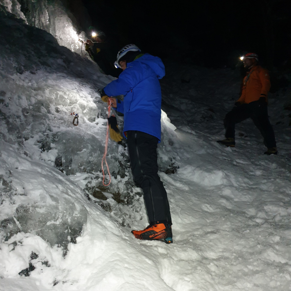 Nadat we mooi op tijd aankwamen in Innsbruck zijn we gelijk naar de Taschachschlucht gegaan, een ijsklimtuin in het Pitztal. Deze lag er super bij, met een temperatuur van -15Co was er een zee aan ijs. Aangezien Jan en Jules nog nooit ijs hadden geklommen en het voor Laura een lange tijd geleden was, begonnen we met wat oefeningen en uitleg. Toen de basics er een beetje in zaten was het tijd om te klimmen. Na wat ongemakkelijke eerste meters groeide het vertrouwen in de bijlen en stijgijzers. Het verbaasde de beginners hoe subtiel je moet zijn voor een sport die er zo bruut uitziet. Met het laatste licht werden nog wat eerste voorklimmeters gemaakt, iets wat met ijsklimmen soms best spannend kan aanvoelen.