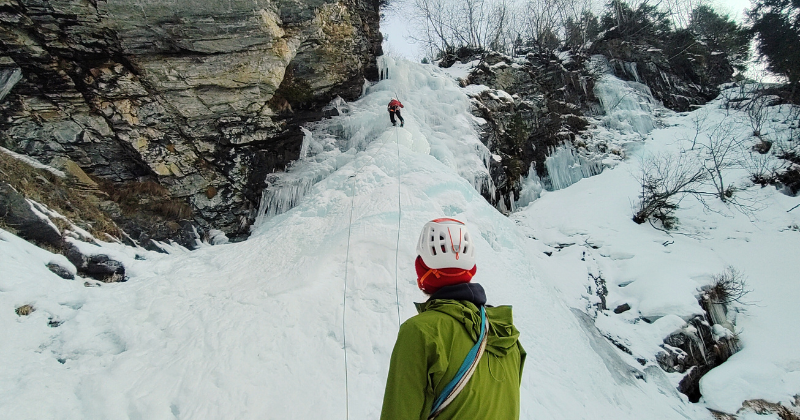 Tijdens de derde dag was het eindelijk zo ver, voor een aantal van ons zou dit de eerste watervalbeklimming worden. We vertrokken met veel energie en stonden al snel onder de waterval. Toen we ons daar aan het voorbereiden waren kwam er ook een andere touwgroep aan, en kwamen we erachter dat door de kou de waterval nu lager ligt dan normaal en de "echte" instap daardoor een stukje hoger lag. We klommen het eerste “extra” stuk snel door en daardoor kwamen we gelukkig nog voor de andere groep uit, wat op een waterval aardig kan schelen. Daarna konden we weer rustig doorklimmen en kwam het grootste obstakel van de route in de derde pitch. Er zat daar een ongemakkelijke mantelpas over een stel druipers die er vrij instabiel uitzagen. Een andere touwgroep was hier al omgedraaid, maar Claartje ging het toch nog even proberen en wist zich er via een veilige weg doorheen te werken! Nadat we door de crux waren ging de rest van de route soepel en waren we rond 12 uur boven.