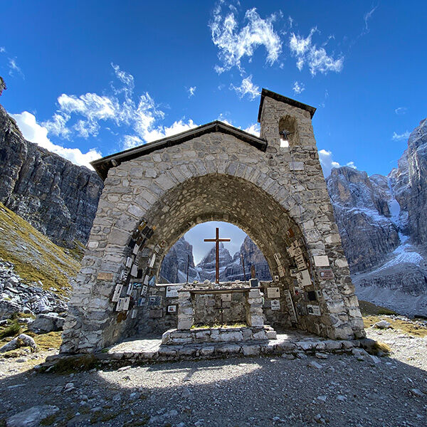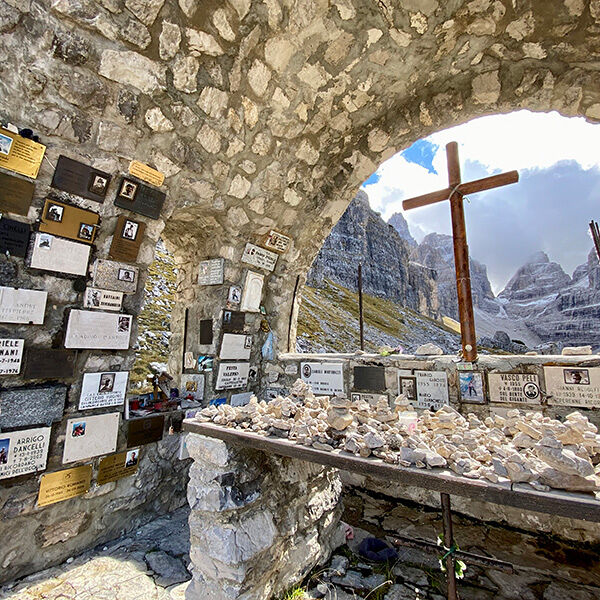 Ruim voor lunchtijd wandel ik het laatste vrij vlakke stuk naar de hut en bewonder het Italiaanse design op deze unieke plek. Achter de hut staat de beroemde kapel en met de opkomende wolken loop ik er direct naartoe om foto’s te maken. Hier hebben bergbeklimmers een ereplaatsje en respectvol lees ik het stukje tekst bij enkele namen en kijk in de ogen van degenen die er niet meer zijn.