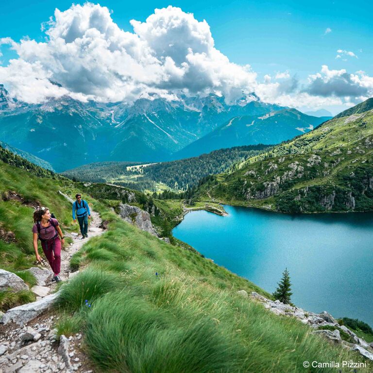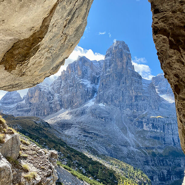 Je kunt hier diverse dagwandelingen maken, maar bekend zijn vooral de vele klettersteigs (via ferrata’s) zoals de Bocchetti Centrali. Ook tijdens deze wandeling loop ik soms een stuk met een staalkabel in de hand. Veiligheid voor alles. Er volgt een natuurlijk tunneltje met fotogeniek doorkijkje dat een voorproefje geeft van al het moois hogerop.