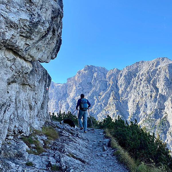 Dit keer geen sneeuw maar een frisse septemberochtend met welgevormde regen- en dauwdruppels op het groen langs het wandelpad welke ik start vanuit in Madonna di Campiglio. De stenen zijn glibberig en de route gaat direct steil omhoog zodat langzaam ‘inlopen’ niet aan de orde is. Houthakkers zijn bezig om flinke stammen naar beneden te takelen en na een korte groet concentreer ik mij direct weer op het pad. Ik zigzag door het bos omhoog terwijl zonnestralen proberen een weg door het bladerdak te vinden. Sneller dan verwacht, sta ik voor de berghut Rifugio Casinei (1825m) waar het licht brandt. Ik heb nog geen behoefte aan koffie en besluit door te lopen. Ik haal diep adem als ik meer uitzicht krijg…. En wat voor één; de Brenta Dolomieten met een laagje poedersuiker van de afgelopen nacht en een diepblauwe hemel waarin de zon voorzichtig hoger klimt. Lykke, mijn hond, heeft direct mijn aandacht als ik een stukje koek uit mijn rugzak haal. Met een kop thee erbij geniet ik met haar van dit fraaie panorama.