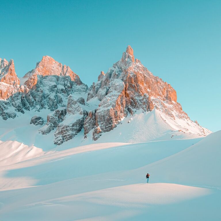 Afdalend laten we al snel de drukke skipistes achter ons. Door de hoogte is de temperatuur laag en begeef je je de verse poedersneeuw. Met de sneeuwschoenen blijven we als het ware drijven op de sneeuw. Voor ons zien we de loodrechte rotswanden van de Punte di Campiglio (2876 m) en de afgeplatte Cima Falkner (2990 m). De laatste is vernoemd naar Alberto Falkner, die in 1882 de officiële eerstbeklimming op zijn naam zette. Waarschijnlijker is het dat plaatselijke jagers al veel eerder op de top stonden, maar zij hebben nooit de moeite genomen dat te laten vastleggen.