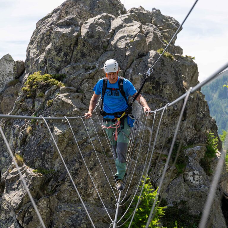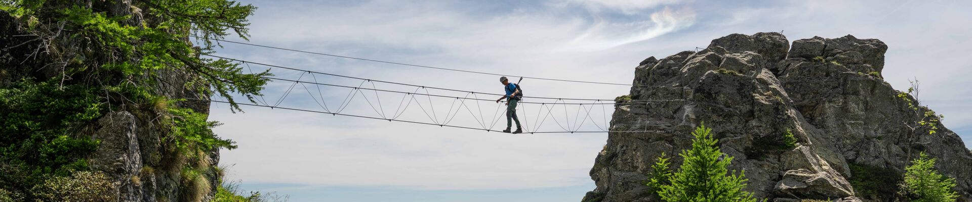 Het eerste stuk van de via ferrata is voor iedereen hetzelfde, omdat ik de hele tijd achterom kijk naar de blauwachtige bergen en Lago Maggiore, word ik al snel ingehaald door een Duitse familie. De jongen heeft dolle pret, maar het meisje is er duidelijk klaar mee, met giechelende ouders voor- en achteraan. Na het eerste stuk raak ik aan de praat met de familie. Ze twijfelen over de route. Uiteindelijk kiezen ze de makkelijkere route. Het meisje besluit toch mee te gaan om niet alleen naar de top te hoeven lopen. Ik heb de smaak redelijk te pakken en kies de moeilijke variant. Een geweldige uitdaging! Naast dat de route heel goed is uitgerust komt dit vooral omdat de route zo afwisselend is. Ten eerste maak je een mooie wandeling naar het beginpunt. Tijdens de via ferrata waan je je in alpien terrein terwijl je uitkijkt op het glinsterende water van Lago Maggiore. Je klimt over een rotsgraat en passeert een spectaculaire hangbrug van 19 meter. Deze brug verbindt trouwens beide routes met elkaar. Beter wordt het niet! Wanneer we klaar zijn en weer teruglopen naar de kabelbaan, besluit ik geen duik te nemen in het meertje, maar een heerlijk drankje te doen op het terras van Grotto Monera.