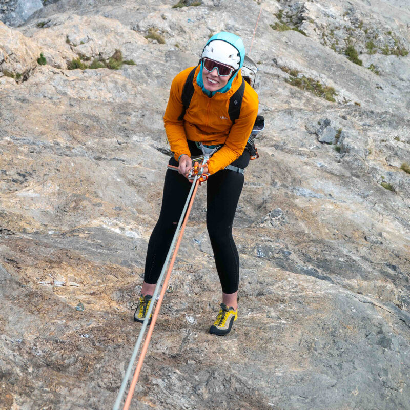 Het kunnen takelen van een rugzak of haulbag na een lastige, steile lengte kan een groot verschil maken in een technische multi-pitch. Ik vond het persoonlijk best een eye-opener! Ik leg meer hierover uit in tip 3. De laatste tijd gebruik ik steeds vaker een enkeltouw in combinatie met een rapline. Aan de andere kant heeft een dubbeltouw ook duidelijke voordelen, vooral in terrein waar de kans op beschadiging van het touw bij een val groot is of als je veel moet abseilen. Je moet afwegen wat het beste bij jouw route past.