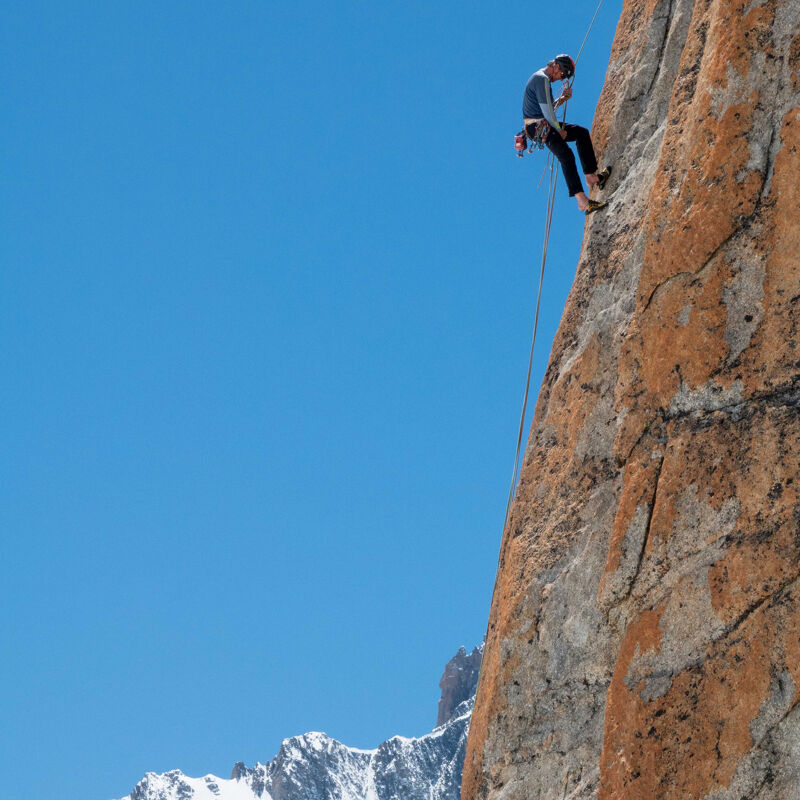 In de Dru noordwand haulden Danny en ik onze zware rugzak met bivakmateriaal in de cruxlengtes. We klommen met een enkeltouw en een rapline. Tijdens de afdaling moesten we 17 lengtes abseilen. Dit verliep goed - een rapline kan dus ook soepel werken tijdens lange abseils. Foto: Bas Visscher.