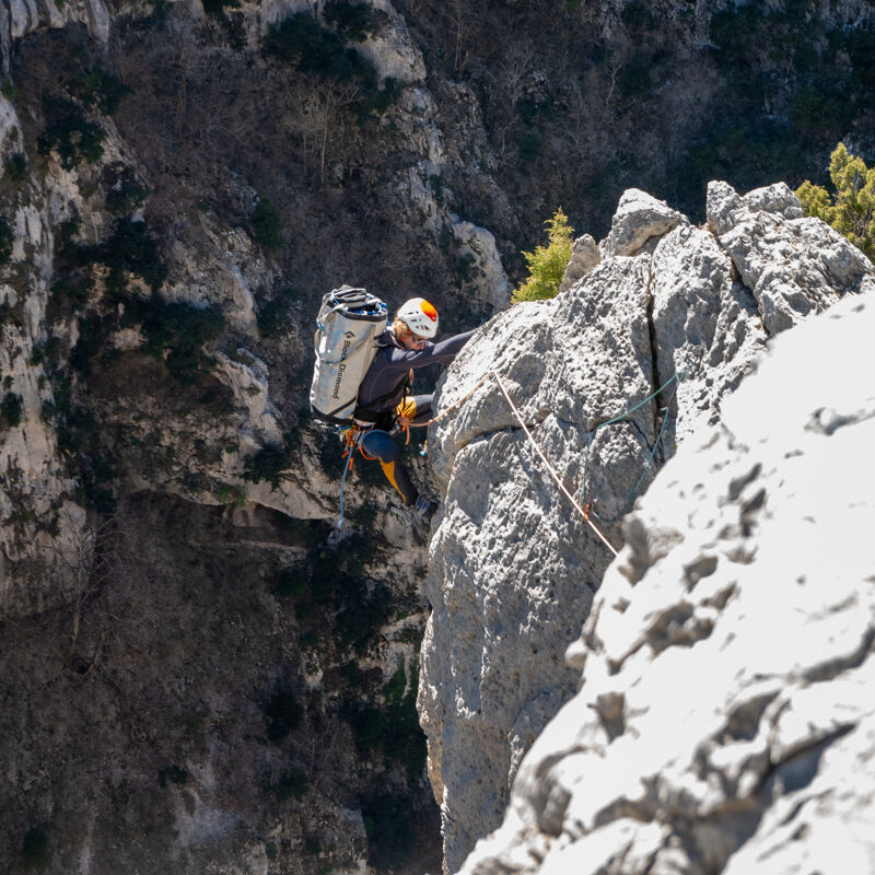 Maël Durand in een 6c-lengte in de Verdon. Als voorklimmer klimt hij zonder rugzak. Hij heeft een rapline (een dun touw) aan zich hangen om de haulbag te takelen. Hiermee kan zowel de voor- als naklimmer zonder zware rugzak klimmen. Foto: Bas Visscher.