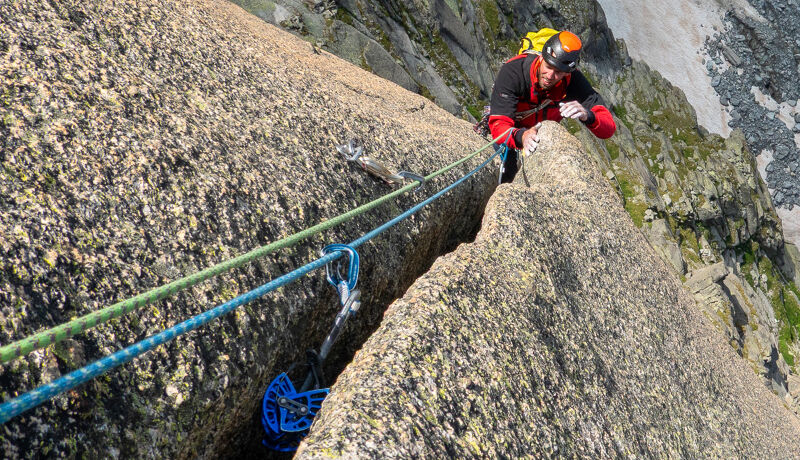 Op deze foto zie je een voorbeeld van halftouwtechniek. De strengen zijn hierbij om en om gekllipt. Het blauwe touw in de cam, het groene touw in de boorhaak met het setje. Op de foto klimt Sjors in de crack-route Majorette Thatcher (6b+, 180m) in het Mont Blanc gebied. Foto: Bas Visscher.