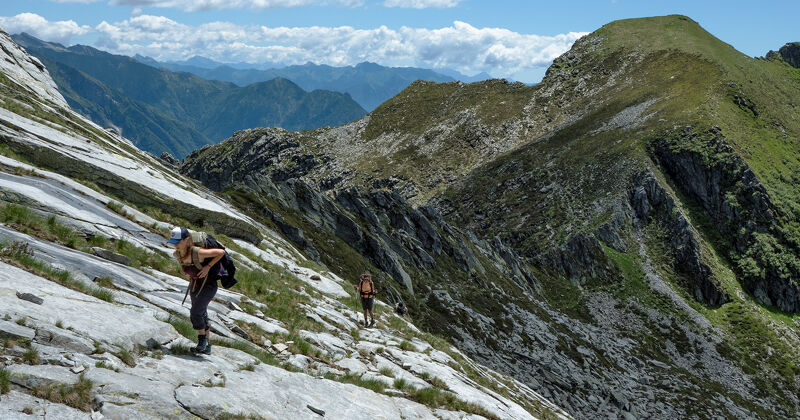Na een kort bezoek aan de Verzasca-zijde van de Pizzo Costisc en Scimarmota volgt de route de zonnige hellingen van de Poncione Piancascia, langs rotsachtige weiden met geiten en gemzen. Nadat we de hoek om zijn, daal je bijna tot de bosrand, kruis je enkele valleien en passeer je de Alpe Cuasca, waar de enige fontein van de etappe staat. Daarna leidt het pad naar de afgelegen Passo dei Due Laghi, de pas die de valleien van Coglio en Giumaglio verbindt. De twee meren hoog op de hellingen nodigen uit tot een pauze, misschien met de voeten in het water of een korte duik. Vervolgens wandel je naar Alpe Spluga, een betoverende plek waar je in stilte in het gras kunt liggen en kunt nagenieten van een geweldige dag.
