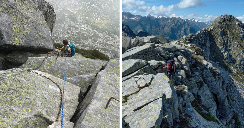 Vandaag wacht een uitdagende etappe. Vanuit Spluga klim je naar de Pascolo dei Laghi en de Bocchetta del Sasso Bello, waarna je het Lavizzaradal binnen stapt. De steile afdaling en instabiele ondergrond vragen om voorzichtigheid, vooral in grotere groepen. Via een uitgestrekt blokkenveld bereik je de Cima di Broglio, gevolgd door eenvoudigere klauterstukken en een spectaculaire luchtige passage met kabels. Daarna volgen nog steenvelden en gladde platen met extra beveiliging. Via de goed uitgeruste Valle dei Pini stijg je e naar de Passo di Chènt. Een complexe afdaling brengt ons in de Val Tomè. Na uren in ruig terrein duikt eindelijk een klein druppelvormig meertje op. Niet veel verder ligt de Capanna Tomeo, waar een warme maaltijd en een bed op je wachten.