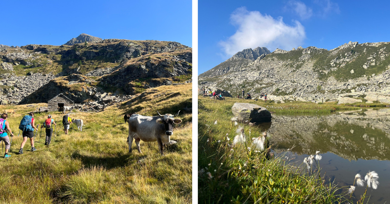 Op lange stukken van de route tussen Piano delle Creste en Capanna Grossalp is het pad niets meer dan een denkbeeldige lijn, aangegeven met blauw‑witte markeringen maar zonder zichtbaar pad. Je loopt hoofdzakelijk door rotsachtig terrein en uitgestrekte, lange stroken bezaaid met stenen en rotsblokken. Het voelt alsof je door een vergeten wereld loopt, omringd door getande kammen en versierd met drie bijzondere meren: Antabia, Cròsa en Formazzöö. Een oase van rust. Nadat je de Bocchetta Formazzöö bent gepasseerd, verandert het landschap plots: de stille steenwereld maakt plaats voor de levendige Bosco Gurin‑vallei, waar groene alpenweiden voor je uitgestrekt liggen.