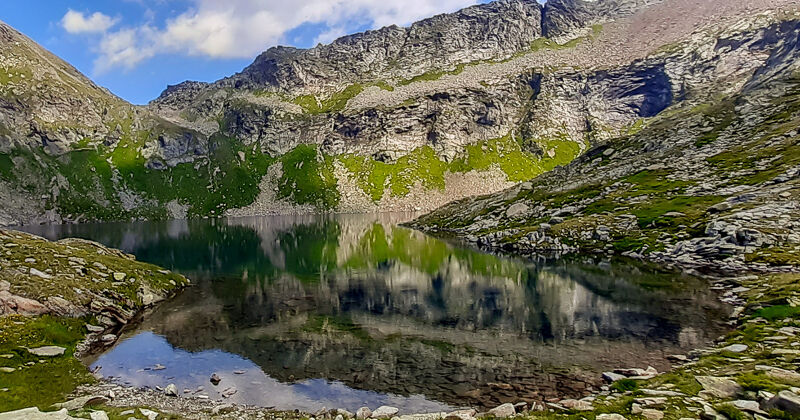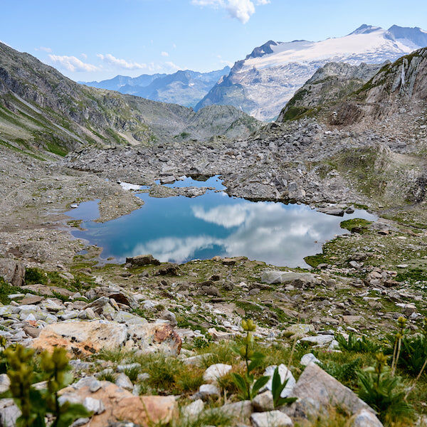 Randinascia is een idyllische plek: een microkosmos van kleine valleien, veenmoerassen, door gletsjers gladgeschuurde rotsen en sporen van eeuwenoude bewoning aan de voet van de Basòdino, omringd door een bijzonder rijke flora. Het is de ideale plek om even stil te staan, het landschap in je op te nemen en te genieten van stilte en frisse berggeuren. Geen haast, de etappe is kort. Volg het pad richting de Bocchetta di Val Maggia en steek over naar Piemonte, de bovenste Formazza‑vallei, waar de Walser zich in de dertiende eeuw vestigden. Het Duitse dialect van Opper‑Wallis klonk hier ooit nog, zoals de namen van de meren verraden: Bodenmeren (Bodenseen), Lago Castel (Kastelsee) en Lago Toggia (Fischsee). Bij de Alpe Toggia ligt het Rifugio Maria Luisa, hier slaap je vanavond.