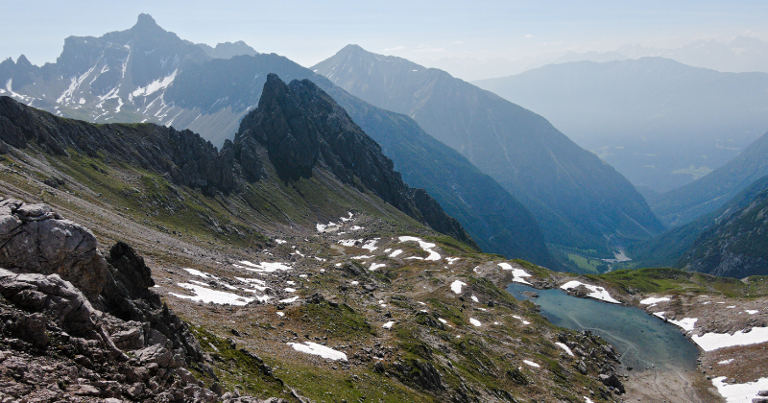 Het eerste stuk van de vierde etappe is gelijk aan het laatste van gisteren, maar nu schijnt de zon en kunnen we iets zien. Plotseling wordt het pad omringd door imposante bergtoppen en ligt er een schilderachtig meertje diep beneden ons. We slaan af naar het Gufelgrasjoch en zetten de allerlaatste stappen omhoog op onze huttentocht. Vervolgens dalen we steil af. Tegen de middag bereiken we de Branntweinboden. Op de kaart had ik gezien dat het pad hier een paar kilometer de beek volgt. Ik dacht: dat gaat vlot. Maar het is te mooi om te haasten. De klaterende beek is onze constante begeleider en ik kan het niet laten: ik hups erin. Een laatste duik voordat we na vier dagen in de natuur, drie overnachtingen op de berg en ontelbare bijzondere momenten terugkeren naar het alledaagse leven.