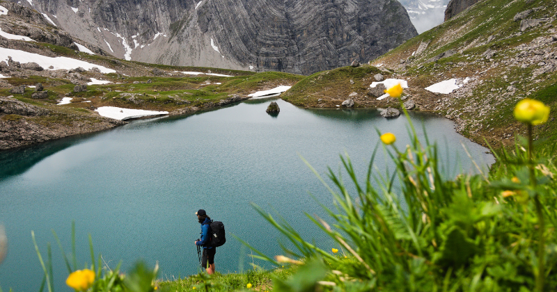 Na de afdaling van een halfuur bereiken we een gedeeltelijk met ijs bedekt meertje. Ik gooi mijn kleding in het gras en duik het water in. Mijn wandelvriend me verbijsterd aan, maar komt me dan achterna. Ik probeer op een ijsschots te zonnebaden en zak er met een plons doorheen. Op dat moment komen twee wandelaars bij het meer aan. “Nu moeten wij er natuurlijk ook in”, zegt een van hen lachend. Even later warmt de zon ons alle vier weer op en wandelen we samen de laatste kilometers naar de Hanauer Hütte. Hier hoog in de bergen is het nog echt lente. Het pad is omzoomd door witte, gele en paarse bloempjes. Als we later op het zonnige terras een knödel eten, is een T-shirt zelfs voldoende – het voelt als zomer.