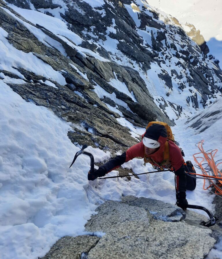 Voor zover wij weten is dit jaar nog geen van beide routes beklommen. Dat betekent veel onzekerheden: ligt er genoeg ijs in de steile lengtes? Is de sneeuw te zacht? Of juist alles kurkdroog? Met ijsbijlen in de handen en stijgijzers aan de voeten klim je een stuk sneller en simpeler door ijs en bevroren sneeuw.