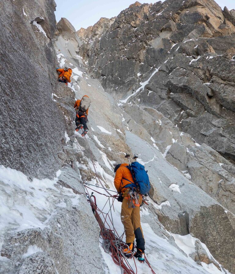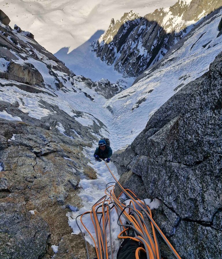 Terwijl Team Frendo na uren ploeteren in heupdiepe sneeuw moest omdraaien, worstelden wij juist met rots die te droog was. Zowel Jules als ik waagden ons aan de vierde lengte, maar het kleine beetje ijs dat er nog was werd met elke angstige slag minder, laat staan dat het genoeg was voor een ijsboor voor de gewilde zekering. De twijfel sloop in. Was dit het moment om al het verstand overboord te gooien en zonder goede zekeringen en op je limiet door te klimmen? Nee — dat is niet waarom we hier zijn.