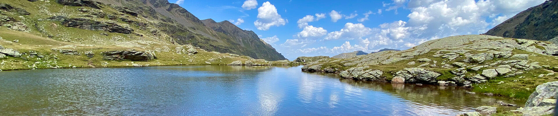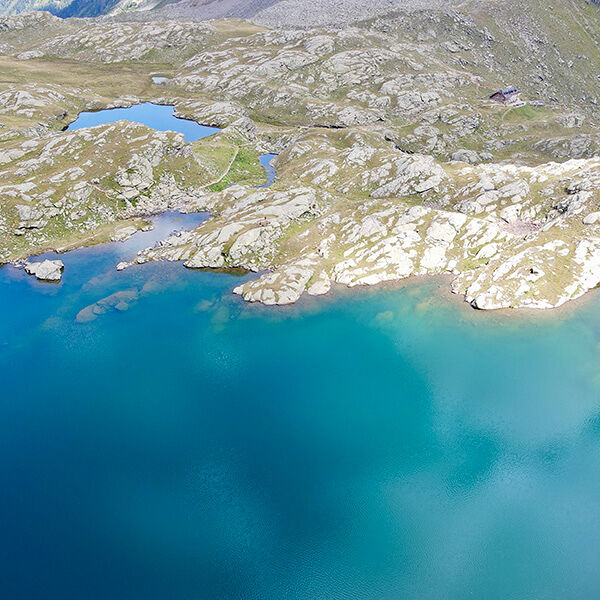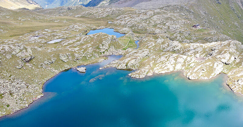 Grote rotsblokken, beekjes links en rechts en plots staan we voor één van de vijf Corvo meren. De wolken weerspiegelen in het water en ik ontdek kikkervisjes die langs de oever verstoppertje spelen. Sandra roept dat het grootste meer vlakbij ligt en op een grote rots genieten we van deze parel op 2.461 meter hoogte. Ik laat de drone opstijgen en krijg zo een nog beter beeld van deze meren en de omgeving. Sandra vertelt de mogelijkheden als je hier verder wandelt richting Val di Pejo of Val d’Ultimo (Ultendal).