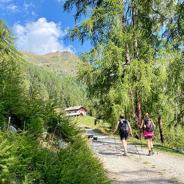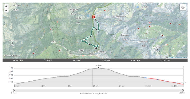 Deze ochtend heb ik vroeg afgesproken met een vriendin aan het begin van Val di Rabbi, een zijdal van Val di Sole. Zij kent de streek op haar duimpje en het plan om samen een wandeling te maken stond al lang op de planning. Een andere vriendin, woonachtig in Padova, is bij mij op bezoek en komt ook mee en zo gaan we met z’n drieën en Lykke op pad. We rijden iets verder Val di Rabbi in omhoog. De bar in het dorpje San Bernardo is erg druk dus stoppen we bij het ouderlijk huis van Sandra. Na een kop koffie met stuk gebak vervolgen we de rit nog een klein stukje tot parkeerplaats Cavallar (1.450 m) nabij het kleine gehucht Piazzola di Rabbi. Op naar naar de hut Stella Alpina al Lago Corvo.