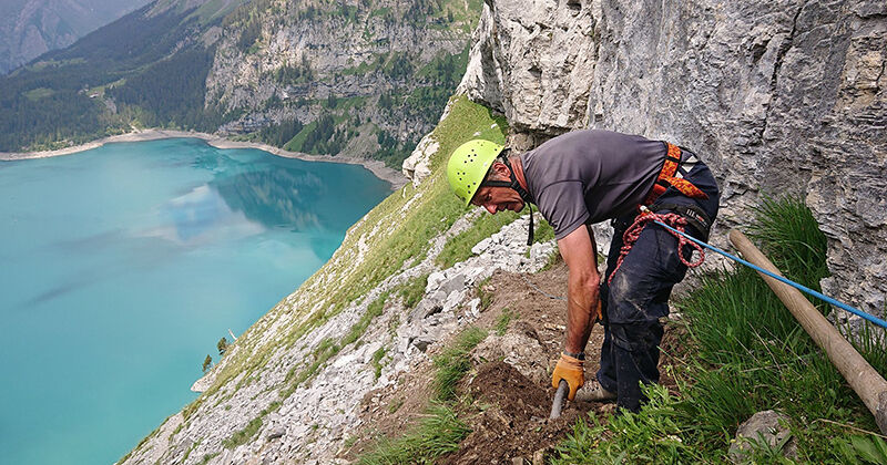 Als je in Kandersteg uit de trein stapte en je blik op de Blüemlisalp richt, kon je de "Spitzen Stei" al zien - tot een paar maanden geleden. Eeuwenlang troonde de monoliet boven het Öschinen-meer. Maar afgelopen winter brak het bovenste deel van de "Spitzen Stei" af en dreigt hij volledig te verdwijnen, inclusief de bergflank waarop hij staat. Anderhalve vierkante kilometer is in beweging. De route van de Fründenhütte vanuit het noordelijke Öschiwald wordt direct beïnvloed door deze situatie en is tot nader order gesloten. De nieuwe weg leidt over de Fründenschnuer, een open pad dat horizontaal langs een machtige rotswand loopt en voorheen alleen beschikbaar was voor alpinisten, gemzen en steenbokken. Als je aan de andere kant van het meer staat en naar de muur kijkt, kun je nauwelijks geloven dat er een manier is voor bergwandelaars om er doorheen te komen.