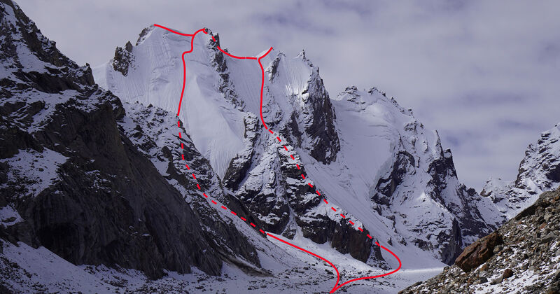 Foto: De routes Snow Symphony (links) en Tak Sham (rechts) op de Chotzangma (5800 meter)