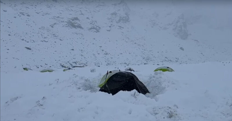 Daar wachtte het team echter een nieuwe uitdaging: drie dagen onafgebroken sneeuwstorm. Met regelmatige uitgraafdiensten wisten de klimmers te voorkomen dat er 's nachts te weinig zuurstof in de tent kwam of dat de tenten instortten. Ondanks de kou en de zware omstandigheden bleef de sfeer goed en voelde iedereen zich fit genoeg om te gaan klimmen.