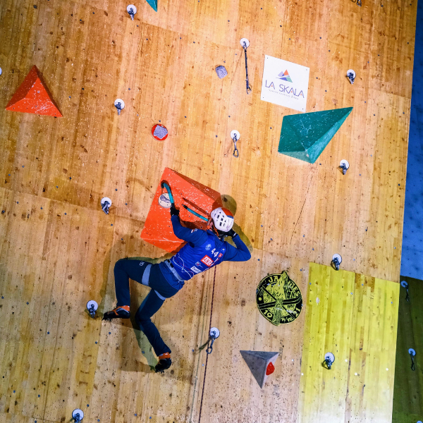Na wat wachten in de isolatie lezen we de route samen in. De dames en heren klimmen dezelfde route, maar de vrouwen krijgen meer klimtijd en kunnen vijf extra grepen gebruiken. Door de grote hoeveelheid finalisten bij de heren wordt de beschikbare tijd voor hen geknepen. Je moet dus snel klimmen! Na het inlezen van de route moeten we weer terug naar de isolatie. Daar even goed opletten wie er weggeroepen werd en wanneer je moet starten met opwarmen. Met verschillende mensen bespreek ik de route en grepen en ik gooi een balletje over met wat Slovenen. Annick klimt eerder dan ik waardoor ik haar beklimming niet kan zien. Gelukkig hebben ze een uitstekende livestream wat later kijken ook mogelijk maakt. Annick klimt sterk en komt hoog in de route. Helaas raakt haar tijd op en moet ze stoppen, time-out. Mijn poging gaat naar wens, mijn doel is het maken van de sprong die in de herenroute zit. Ik ben kalm als ik begin, ik let op een rustige ademhaling en kom goed in de route met een helder hoofd. Annick roept de tijd en ik begin te versnellen, ik wil nog de sprong halen. Daar aangekomen hoor ik: “Tom, nog 30 seconden!”. Ik heb van tevoren bedacht hoe ik de sprong wil maken maar daar aangekomen ben ik er niet zo zeker meer over. Waar laat ik nou mijn andere bijl, op mijn schouder, in mijn hand, in mijn mond? Het is druk ik mijn hoofd en er is geen tijd. Haal ik überhaupt nog adem? Ik doe een testpoging en daarna ga ik ervoor. Tijdens de afzet schiet mijn voet weg en tuimel ik naar beneden. Adem. Oké, doel gehaald, sprong geprobeerd. Glimlach, zwaai. Omhelsd door mijn vrouw.