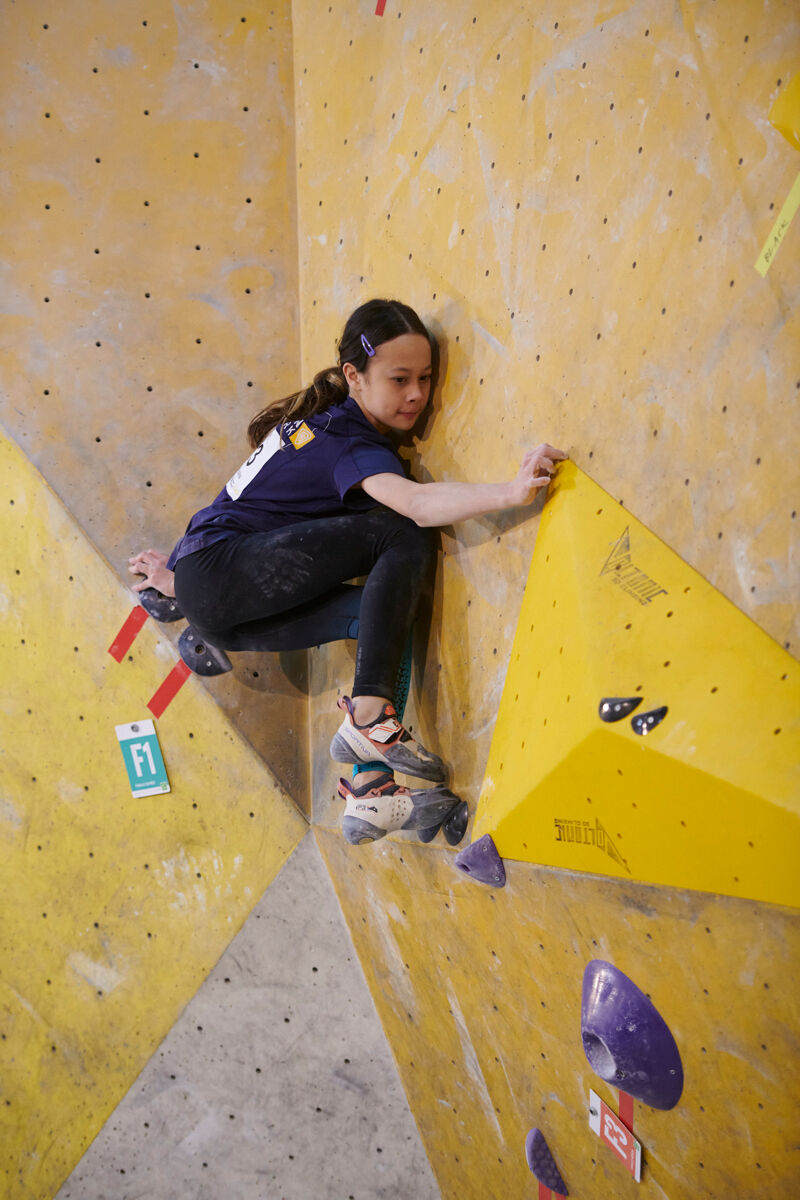 Boulder 2 van de dames begint met kleine randjes in een dak, om vervolgens via grote slopers naar de eindgreep te gaan. Deze eindgreep is een zogenaamd “brievenbusje”, een kleine spleet tussen twee grepen. Goed mikken is dus essentieel. De jonge Sabina ziet er extra klein uit tussen al deze grote grepen, maar ze klimt rustig en beheerst en weet uiteindelijk de boulder te flashen. Het publiek is vol bewondering. Ook Lisa, Tiba en Lynn noteren een flash.