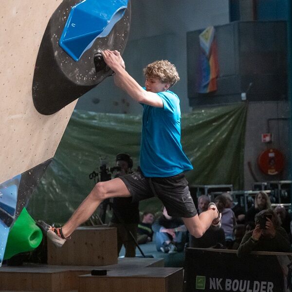 Dat kan maar op één iemand duiden: Abel Mensink. De klimmer van boulderhal Delfts Bleau is in de kwalificatieronde al in vorm met drie tops, maar doet er in de finale nog een schepje bovenop. Abel topt alle vier de boulders en is Nederlands kampioen! Het ongeloof druipt van hem af na boulder 4. “Ik kan het nog steeds niet geloven” is wat de 22-jarige klimmer net kan uitbrengen. “Deze dynamische boulders lagen me wel, maar ik ben nog steeds heel erg verrast en kan het niet beseffen.” Daarna wordt hij omhelsd door iedereen van Delfts Bleau en is het feest voor hem compleet. “Mijn moeder haalt nu nog champagne en dan gaan we het wel vieren.”