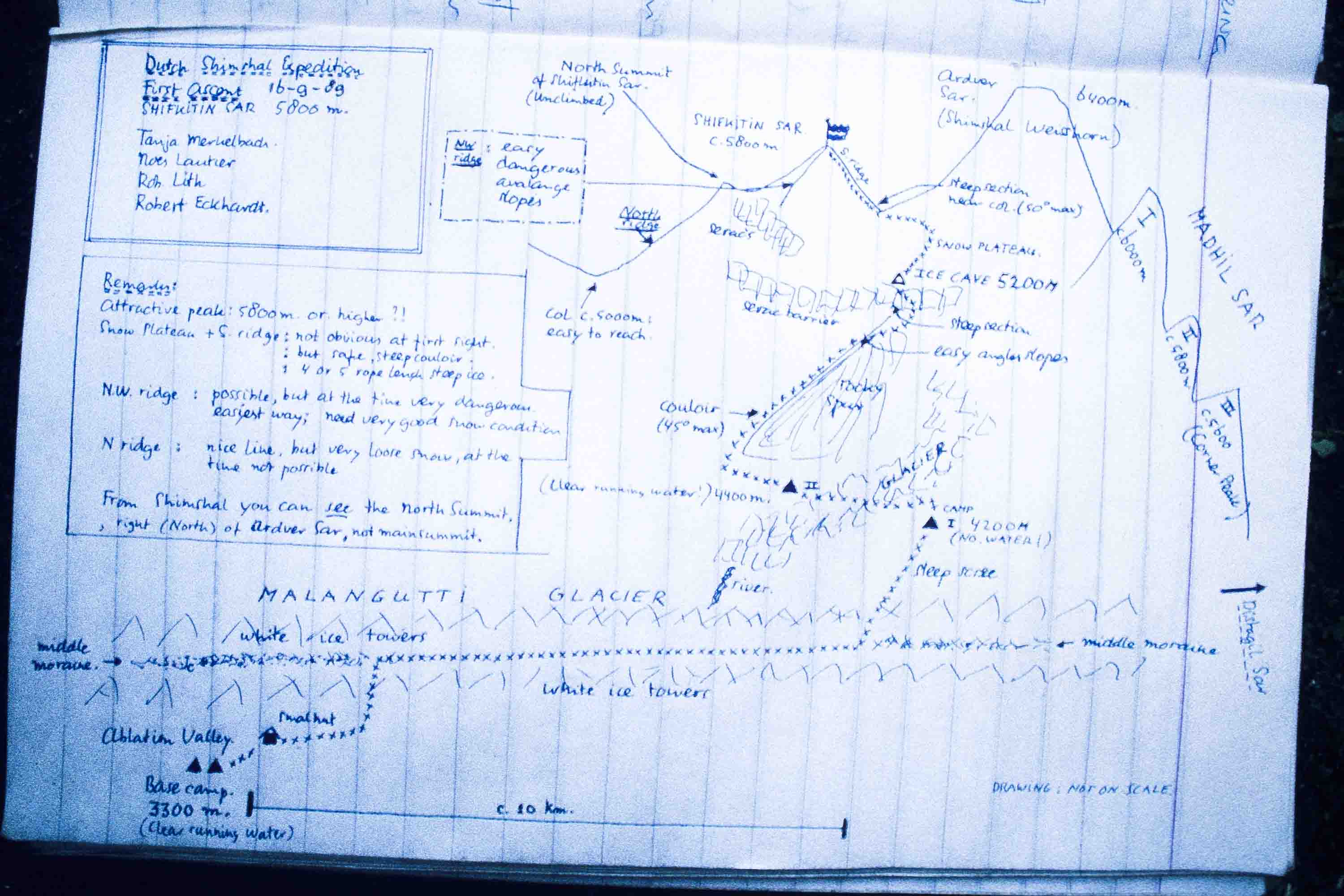 Een Iers expeditieteam verkende in 1986 de Malanguti-gletsjer bij Shimshal. Zij deden een poging om Shifkitin Sar te beklimmen, maar slaagden daar niet in. Shifkitin Sar (of Shifkteen Sar) was in 1989 dus nog nooit beklommen. De Nederlanders richtten zich op Shifkitin Sar, omdat dit de hoogste berg ‘onder de 6000 meter’ in de regio was. Onder de 6000 meter heb je in Pakistan heb je geen vergunning en expeditiepersoneel nodig.