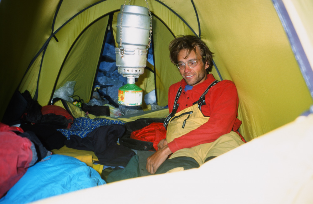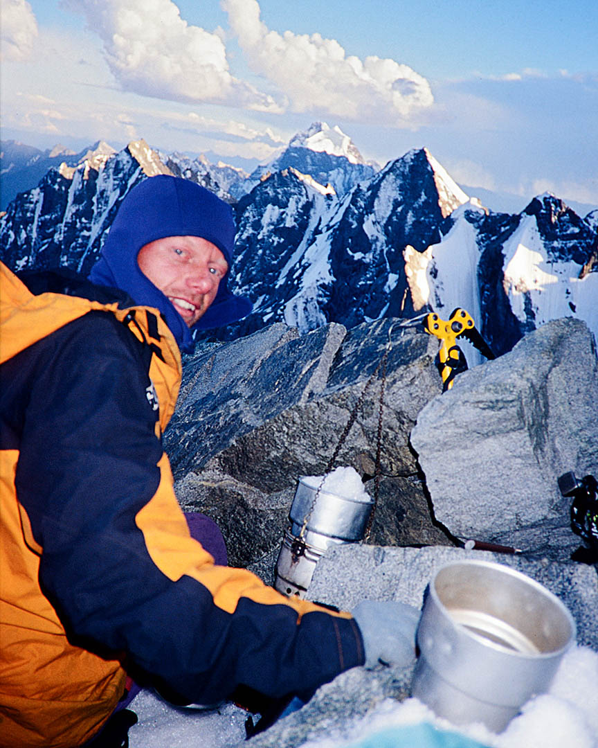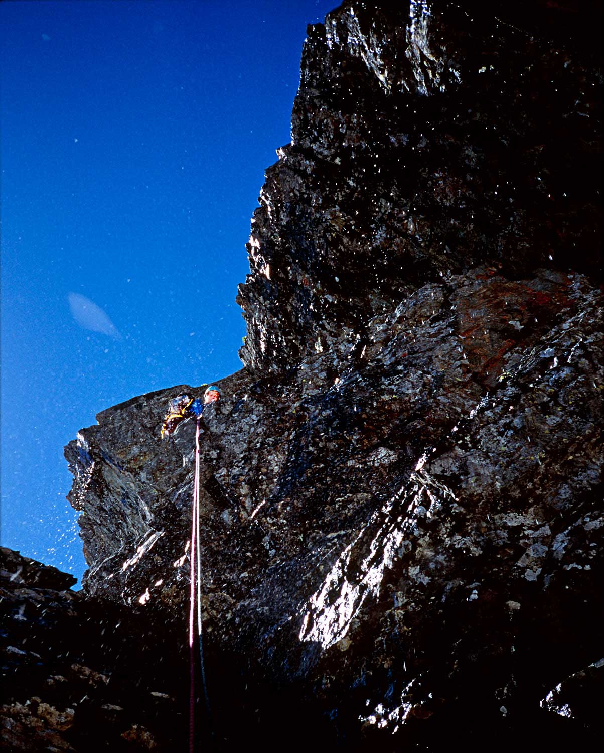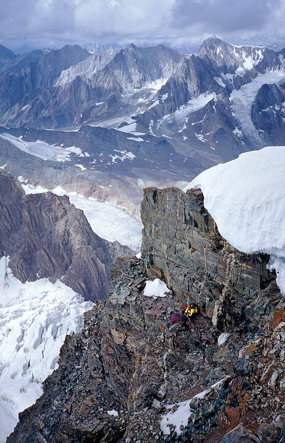 ‘Als ik naar de rotte toren traverseer hou ik mezelf met mijn vingertoppen in balans tegen een blok. De kleinste aanraking is voldoende en het blok schuift naar beneden waardoor ik een kleine val maak. Gelukkig blijft het steentje waarover Andreas mij zekert wel liggen. We klimmen heel veel lengtes af maar als het terrein moeilijker wordt moeten we abseilen. Ons materiaal raakt op en het is nog een heel eind. Om materiaal uit te sparen neemt de laatste die van de standplaats vertrekt al het materiaal mee minus 1 rotshaak waaraan de laatste abseilt. We doen dit een paar lengtes tot mij diep in de nacht een onbestemd gevoel bekruipt. Vanaf dat moment besluiten we dat we beiden aan 2 haken abseilen en als al het materiaal op mocht zijn zien we weer verder. Een volgende abseil vliegt 1 van de 2 standhaken eruit, mijn hart slaat 10 keer over als ik in een schok een met lager hang aan het touw. Als het terrein makkelijker is klimmen we het laatste deel af naar de gletsjer. Daar lopen Benno en Elwin ons ongerust tegemoet met thee en proviand. We zijn blij elkaar weer te zien.'