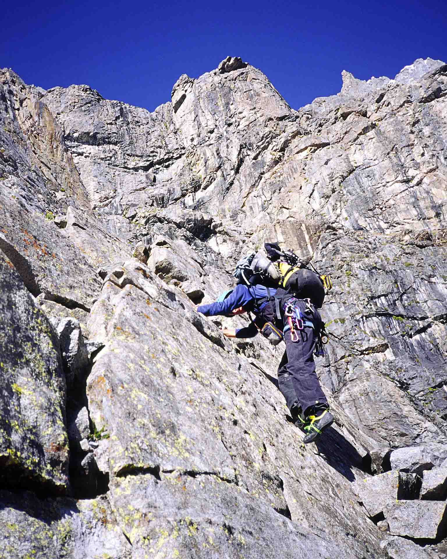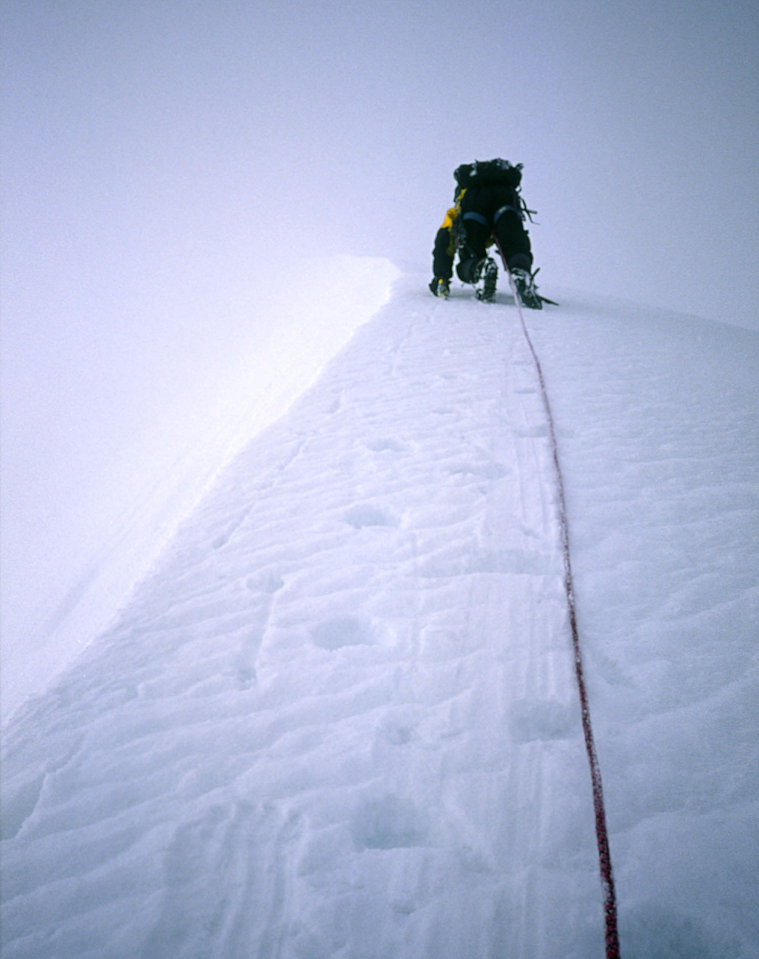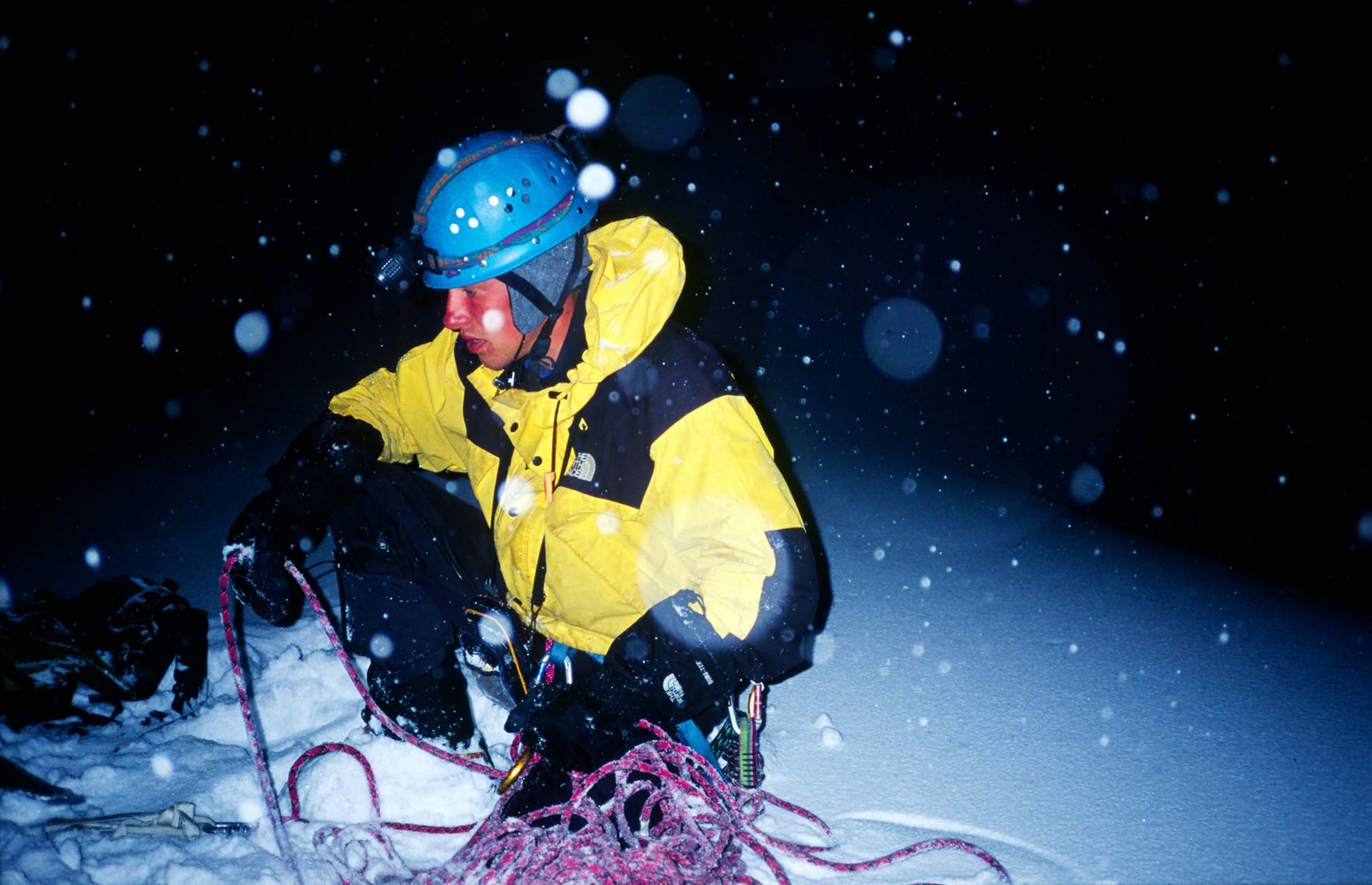 ‘Als ik naar de rotte toren traverseer hou ik mezelf met mijn vingertoppen in balans tegen een blok. De kleinste aanraking is voldoende en het blok schuift naar beneden waardoor ik een kleine val maak. Gelukkig blijft het steentje waarover Andreas mij zekert wel liggen. We klimmen heel veel lengtes af maar als het terrein moeilijker wordt moeten we abseilen. Ons materiaal raakt op en het is nog een heel eind. Om materiaal uit te sparen neemt de laatste die van de standplaats vertrekt al het materiaal mee minus 1 rotshaak waaraan de laatste abseilt. We doen dit een paar lengtes tot mij diep in de nacht een onbestemd gevoel bekruipt. Vanaf dat moment besluiten we dat we beiden aan 2 haken abseilen en als al het materiaal op mocht zijn zien we weer verder. Een volgende abseil vliegt 1 van de 2 standhaken eruit, mijn hart slaat 10 keer over als ik in een schok een met lager hang aan het touw. Als het terrein makkelijker is klimmen we het laatste deel af naar de gletsjer. Daar lopen Benno en Elwin ons ongerust tegemoet met thee en proviand. We zijn blij elkaar weer te zien.'